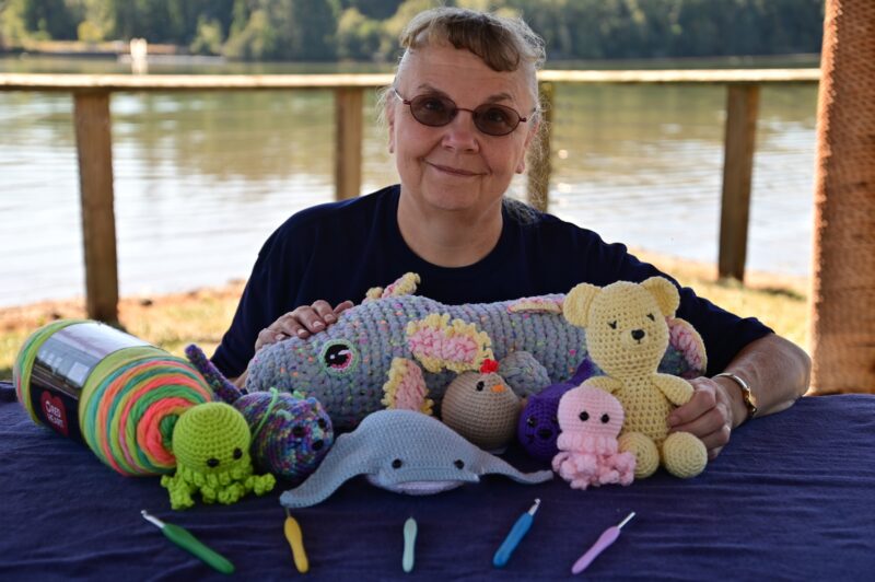 I come from a long line of crocheters. My great grandmother, grandmother, mom, both aunts on my mother’s side, and I also have a daughter and granddaughter that crochet. I have crocheted blankets for my friends that have had babies, as well as co-workers. I believe that I am up to approximately 25 blankets that I have made for other people. My aunt showed me how to make pot holders in a continuous round, so I did a lot of those. Then a couple years ago I had surgery on my foot, and was bored. I was unable to do much of anything as I was not supposed to bear weight on my foot, so I started watching youtube and it opened me up to a whole new world of crochet. My first item was a little bear. Looking back at it, it looks kind of sad, but also not bad for my first ever amigurumi (Japanese name for crocheted or knitted stuffed toys) item. I then started crocheting all kinds of other items. My most adventurous was a reversible toy. One side was an axolotl, and it reversed to a whale shark. While it’s not perfect, I considered it a success.